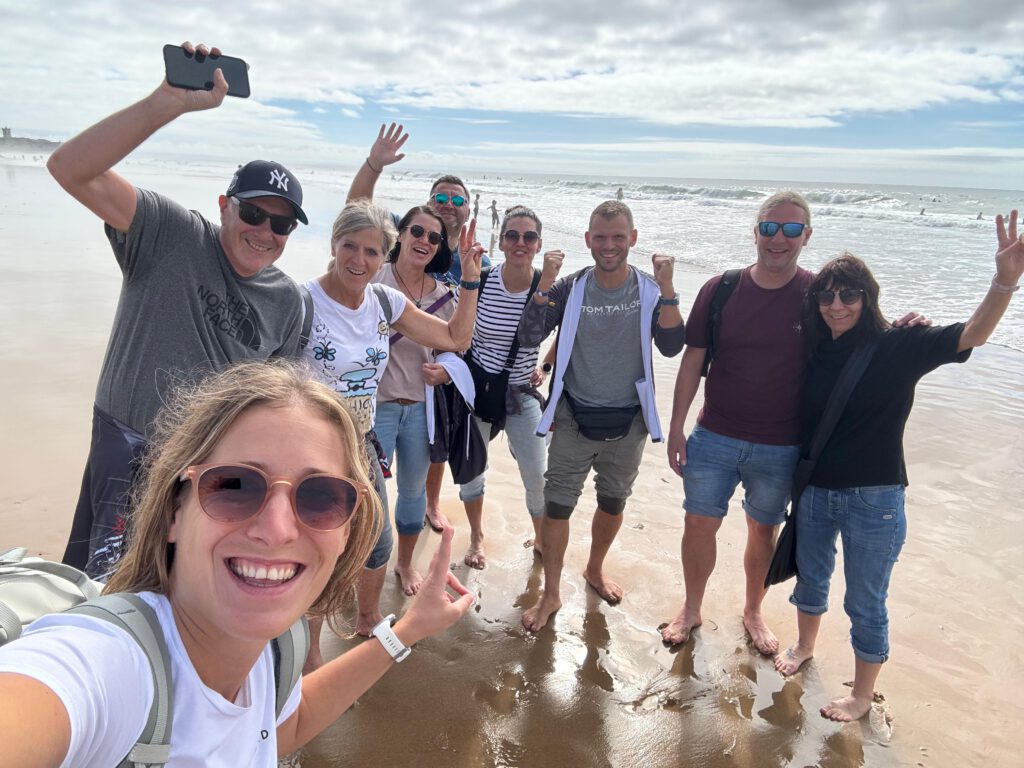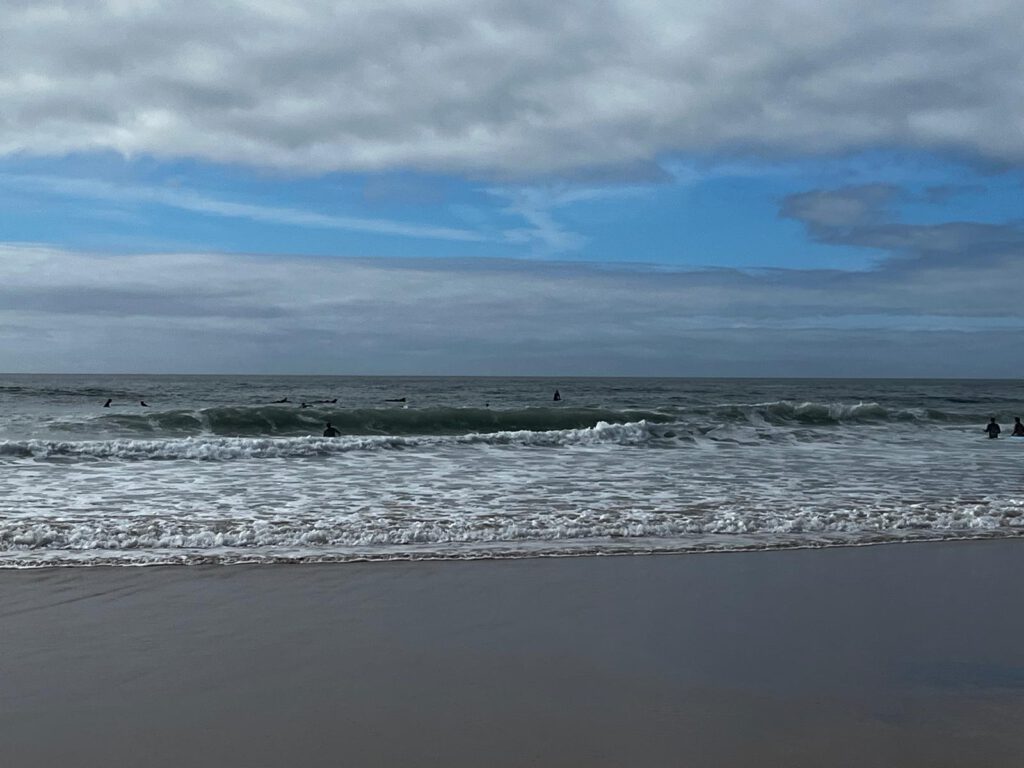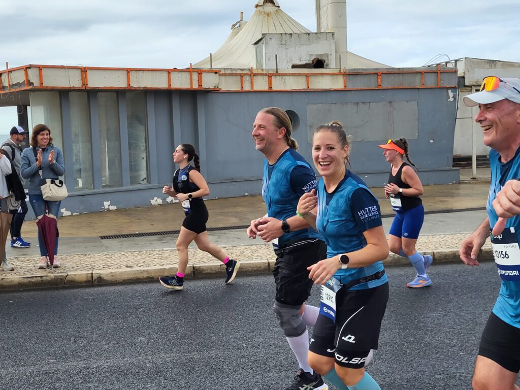 Nach einem ausgiebigen Frühstück machten wir uns mit dem Zug auf den Weg nach Carcavelos – dem Startpunkt des Marathons. Dort erwartete uns nicht nur der Blick auf die Startlinie, sondern auch ein traumhafter Strand mit Surfern, Sonne und Meeresrauschen. Barfuß im Sand spazieren, tief durchatmen, die Wellen beobachten – ein Moment der Ruhe und Inspiration vor dem großen Tag.